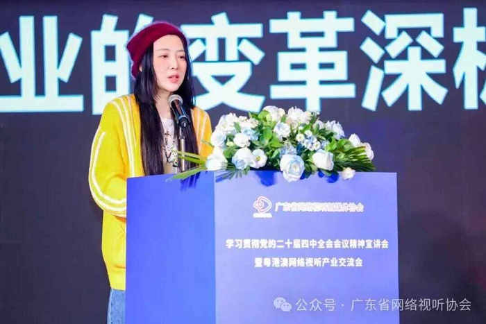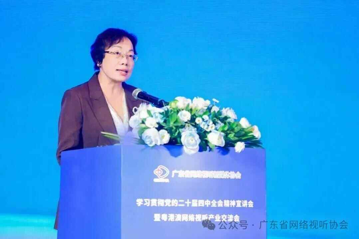 广东省网络视听新媒体协会会长、广东省人大常委会委员、华侨民族宗教委员会副主任委员叶志容主持学习贯彻党的二十届四中全会精神宣讲会,叶志容表示,王晓局长的分享兼具理论深度、实践温度与思想高度,希望大家以此次王晓局长的宣讲为契机,进一步深学细悟,将学习成果转化为企业发展的指引。叶志容指出,文化强国、数字中国、粤港澳大湾区建设等国家战略,为广东网络视听行业开辟了广阔发展空间。她强调,站在协会第二个十年的新起点上,协会将继续以‘服务行业、凝聚共识、推动发展’为宗旨,与广大会员单位并肩同行。
