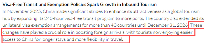 文章分析认为,2025年11月,中国将240小时过境免签政策扩大到更多口岸,并将40余国单方面免签政策延长至2026年12月31日,以增强中国作为全球旅游目的地的吸引力。这些变化在促进外国游客入境方面发挥了至关重要的作用,游客现在可以更轻松地入境中国,停留更长时间,旅行方式也更加灵活。