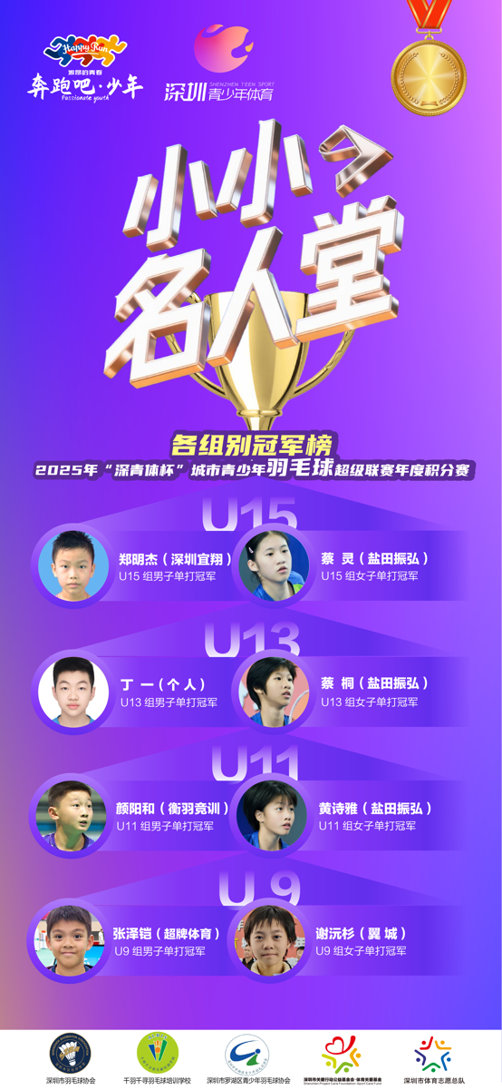 作为深圳市深化体教融合、促进青少年健康发展的重要载体,本次赛事设置U9、U11、U13、U15四个年龄组别,涵盖男单、女单两大项目,采用“小组赛+淘汰赛”核算个人成绩。除了对年度赛各组别前八名选手分别给予不同额度奖金激励外,各组别冠军更将入选“小小名人堂”,记录运动成长轨迹,形成“以赛促练、以赛选才”的良性机制。