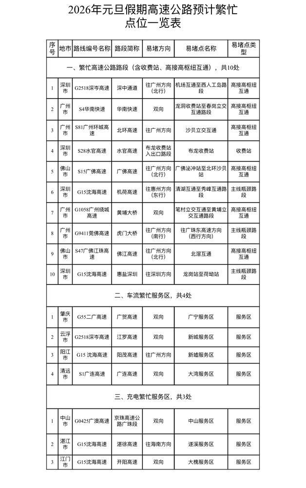 经与省公安厅交管局联合研判,2026年广东省元旦假期较为拥堵的路段、收费站、车流较饱和服务区以及充电设施利用率高的服务区详见附表。今年元旦假期,全省交通运输部门积极会同各方,提前研判,周密部署,合力保障公路运行安全畅通有序。