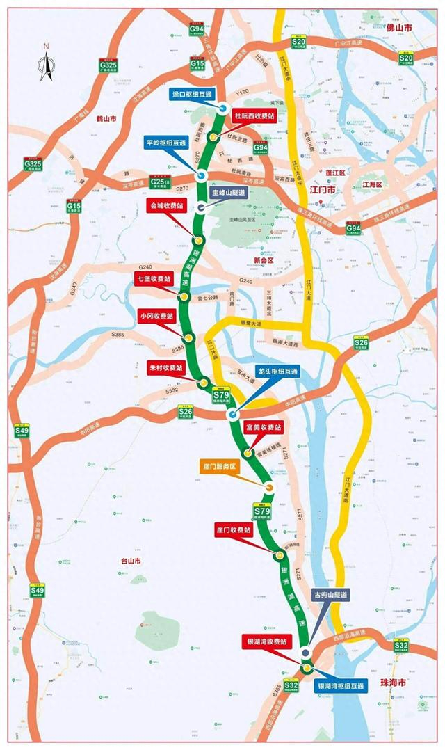 据悉,从2025年12月31日15时起,机动车可从会城、七堡、朱村、富美、崖门、银湖湾等6个出入口驶入(出)该高速。同时,银洲湖高速已实现与江鹤高速、中阳高速、西部沿海高速的联接,通过这些路线接入大湾区及粤西地区的高速公路网络。