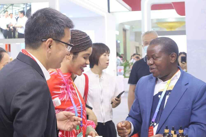 6月13日,在第四届中国—非洲经贸博览会,来自布隆迪的阿尔弗雷德·布里马索(右一)向客户推介展品。新华社记者周昊瑾摄