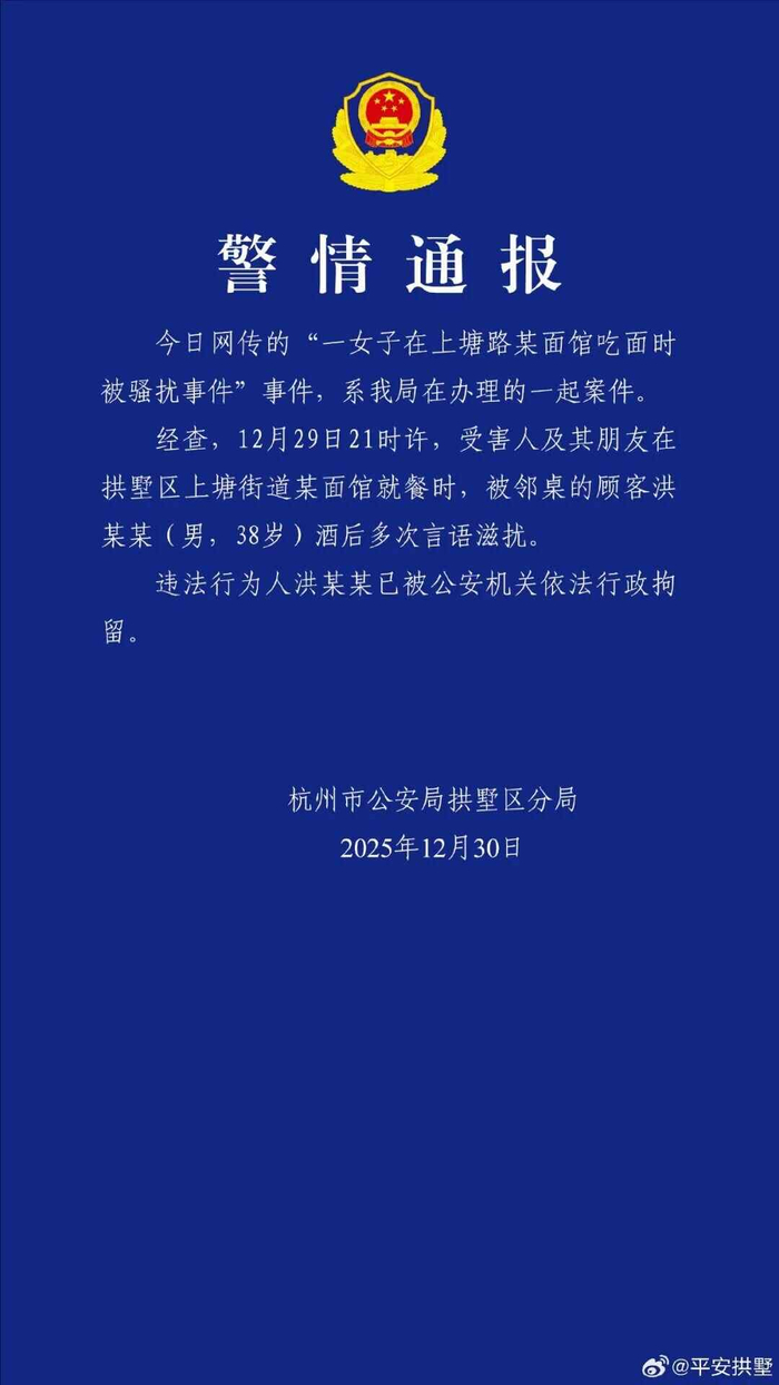12月30日,杭州市公安局拱墅区分局发布警情通报:今日网传的“一女子在上塘路某面馆吃面时被骚扰事件”事件,系我局在办理的一起案件。