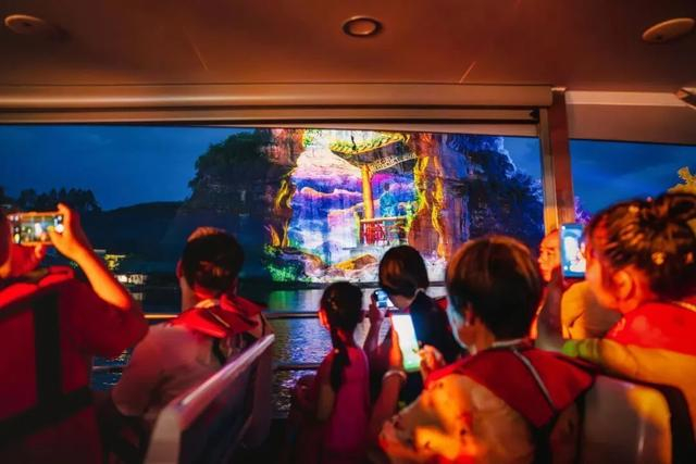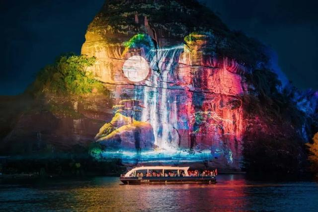 作为首个以世界自然遗产为主体的夜游产品,“万古丹霞”以丹霞山5公里山水实景为空间,巧妙运用岭南画派、粤绣等多种文化元素为设计灵感来源,通过灯光、投影等顶尖科技手段,在近岸、崖壁、远山及船上载体打造出7大场景与28个景观效果,为游客奉上一场追溯自然与人文的沉浸式视听盛宴。