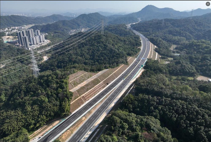 增天高速沿线途经油麻山森林公园、金坑林场、龙眼洞林场、南香山森林公园、天鹿湖森林公园等多个环境敏感点,生态环保要求高。为此,项目在规划和建设中始终坚持“绿色生态选线、绿色低碳建造”原则,着力打造一条绿美生态景观廊道。