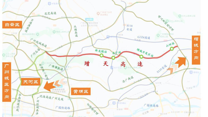 增天高速线路示意图卢辉透露:“增天高速是广州增城至佛山高速公路(增城至天河段),远期还要西连佛山,形成广州东部、北部片区由东到西的大动脉。增天高速未来还有东延线至河源,整条线路拉通后,实现河源、惠州、增城、广州中心城区、佛山的东西走廊带大通道。”