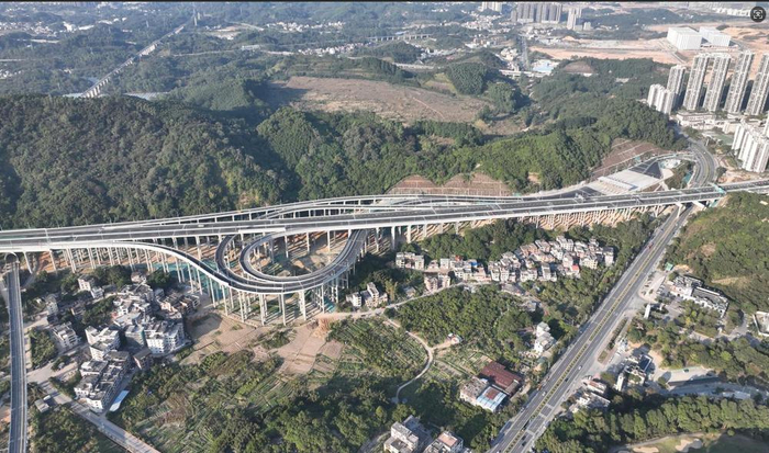 针对全线弃方量较大的特点,项目通过优化线位设计、改造桥下空间与互通区微地形、设置填平区等方式,有效削减弃方、减少资源浪费;在油麻山隧道进出口的中央分隔区域增设光伏发电系统,年发电量可达约55万千瓦时,实现清洁能源高效利用;研发广东省首个高速公路项目级建设期碳排放核算管控平台,实时动态采集施工现场建筑材料消耗、施工机械及运输设备能耗等数据,实现碳排放的精准管控。目前,项目已成功入选省级绿色公路示范项目。