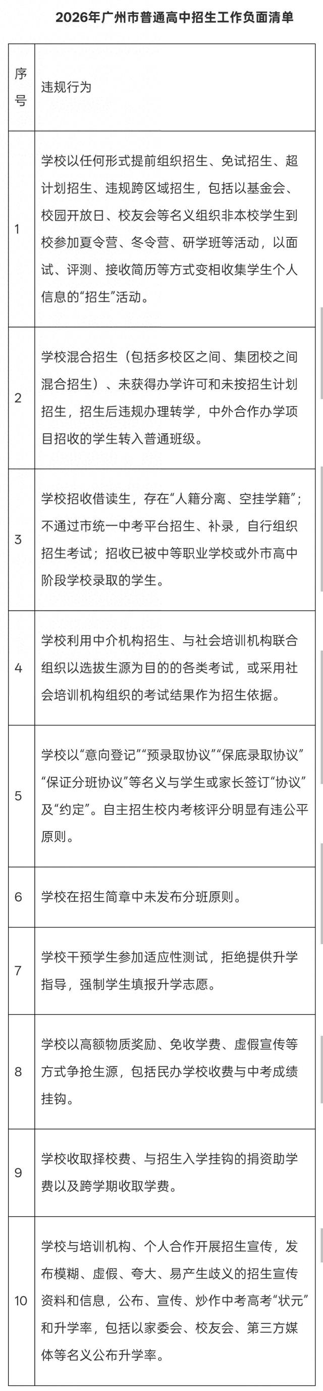 广州市教育局表示,为全面贯彻党的教育方针,落实立德树人根本任务,切实维护教育公平,根据教育部办公厅《关于开展基础教育“规范管理提升年”行动的通知》,深化招生规范治理工作,在《广州市高中阶段学校考试负面清单》基础上,结合实际,制定《2026年广州市普通高中招生工作负面清单》。