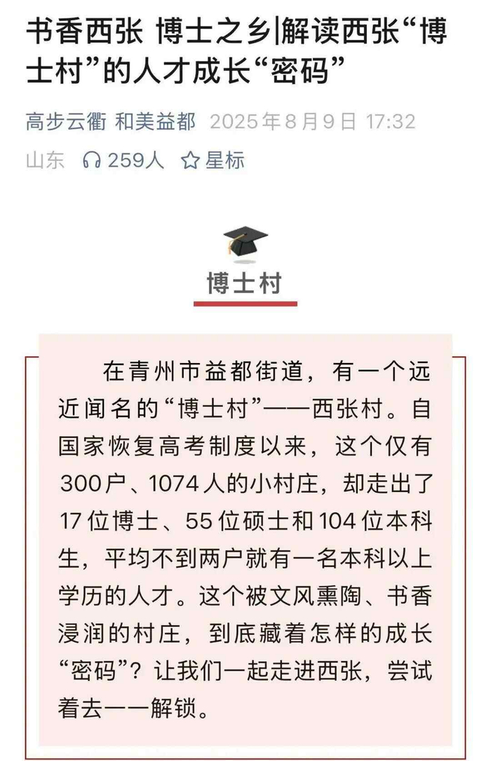 图源:高步云衢和美益都公众号据益都街道官方微信公众号消息,西张村又被称为“博士村”,自国家恢复高考制度以来,截至今年8月,这个仅300户、1074人的村庄,已走出17位博士、55位硕士及104名本科生,平均不到两户就有一名本科以上学历人才。