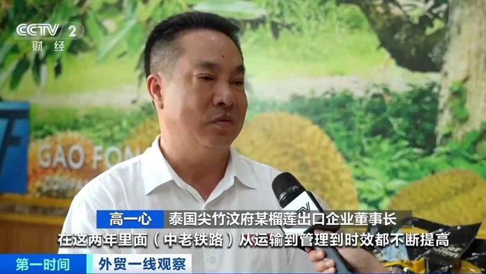 泰国尖竹汶府某榴莲出口企业董事长 高一心:在这两年里,中老铁路从运输到管理到时效都不断提高,而且运输量也不断增长。
