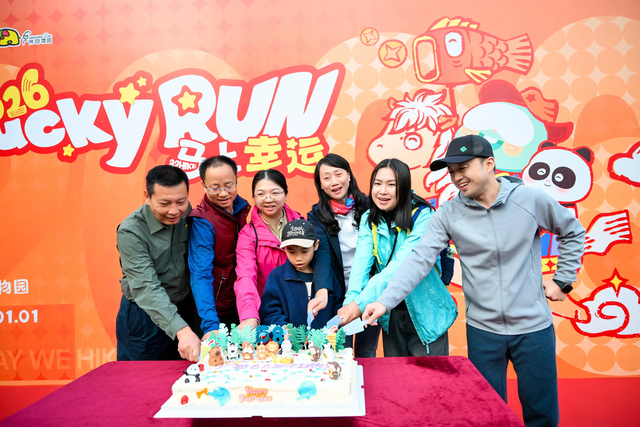 上午8点,新年第一缕阳光洒满广州动物园南门广场。园方邀请同为元旦生日的市民一同切开生日蛋糕,设现场抽奖环节,送出精心设计的2026年限定年卡,点燃全场氛围。