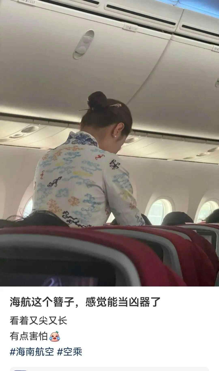 近日,有网友在社交平台晒出海南航空空姐头戴发簪的照片,并配文:“看这个簪子又尖又长,有点害怕。”帖子一出,引发网友热议。