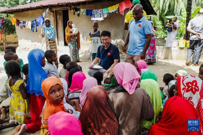 1月1日,在坦桑尼亚桑给巴尔的奔巴岛,中国援助坦桑尼亚“桑给巴尔血吸虫病防治技术项目”专家组队长汪伟(中)与当地儿童交流,开展健康宣教。新华社发(赫尔曼·埃马纽埃尔摄)