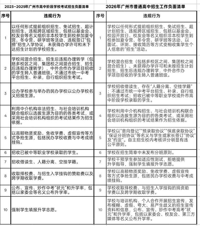 近几年,每年市教育局、市招考办发布的普通高中招生工作的文件,基本都有“负面清单”作为附件。例如,2023年5月4日,《广州市招生考试委员会办公室关于做好2023年高中阶段学校招生填报志愿工作的通知》中,附件2《广州市高中阶段考试学校招生负面清单》规定十条违规行为。近年来,重大中考政策附件中的负面清单基本都是这十条。几天前发布的2026年最新版“负面清单”稍有变化。