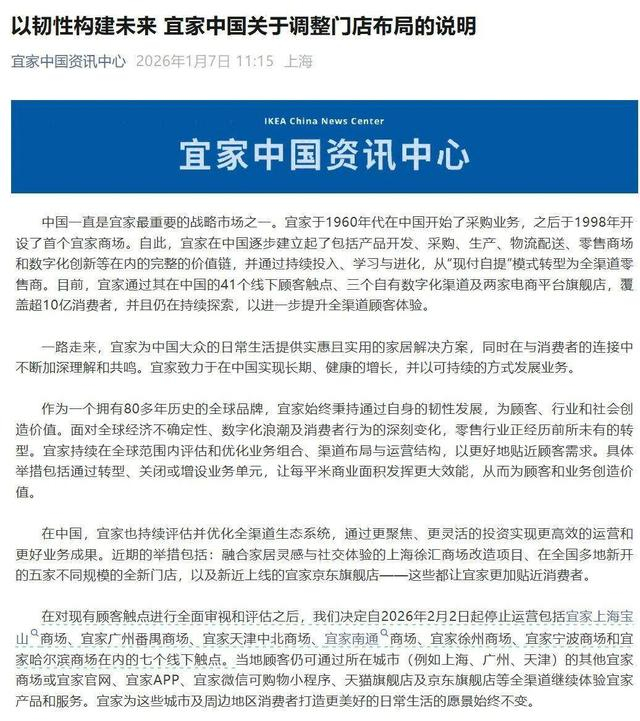 2026年1月7日,宜家中国宣布了一项重大调整:自2月2日起,停止运营位于上海宝山、广州番禺、天津中北、南通、徐州、宁波和哈尔滨的七家线下门店。这一决定标志着这家源自瑞典的家居零售巨头在中国市场的战略调整进入深水区。