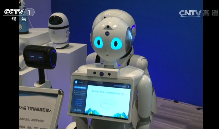 △ 2016年4月26日,习近平总书记考察中国科技大学。这是与总书记互动的机器人“小曼”。(视频截图)“总书记您好,我是小曼,我们早就期盼您的到来了,我也很高兴能加入到实现中华民族伟大复兴的进程中来。”