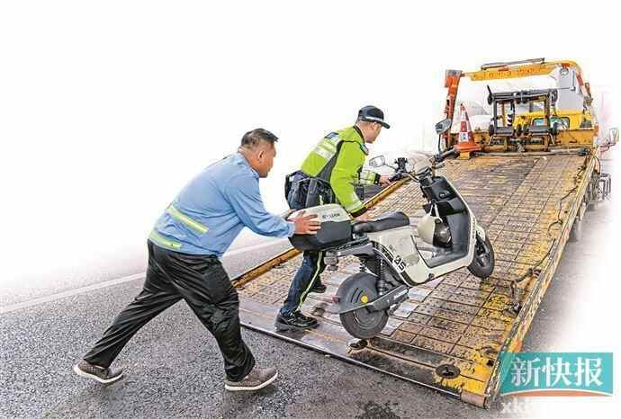 ■广州交警将无牌电动自行车转移到拖车上。广州处罚查封非法改装店1565家