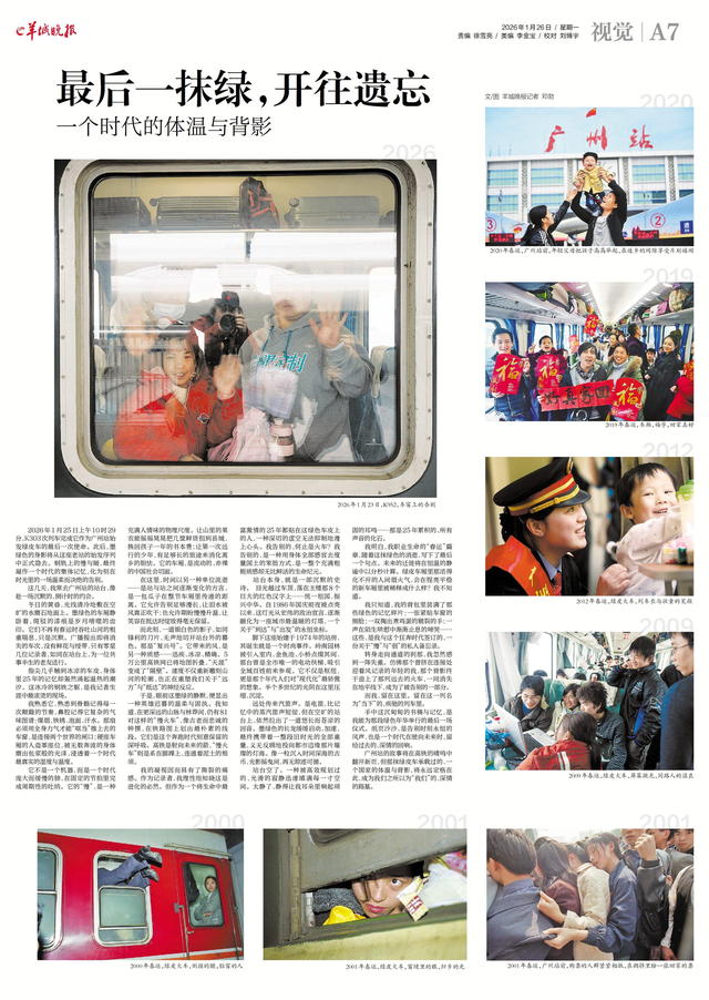 2026年1月25日上午10时29分,K303次列车完成它作为广州站始发绿皮车的最后一次使命。此后,墨绿色的身影将从这座老站的始发序列中正式隐去。钢轨上的慢与暖,最终凝作一个时代的集体记忆,化为刻在时光里的一场温柔而决绝的告别。