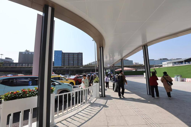 二是优化服务供给,提升出行便捷体验。针对春运期间旅客出行需求激增的特点,越秀区同步完善配套服务设施:修建火车站东广场网约车、社会车辆上下客区风雨连廊,并于1月30日正式启用,为旅客出行添上“保护伞”。这座占地约250平方米的连廊采用铝单板、铝塑板等高品质材料打造,实现了与东进站口的无缝衔接,旅客从下车到进站全程“无雨化”通行,彻底告别风吹日晒雨淋的困扰;将传统围挡升级为花箱式护栏,兼顾环境美化与通行划分。同时重构区域指示标识体系,以清晰设计、科学布局让关键区域一目了然,切实降低旅客寻路成本,提升出行便捷度。