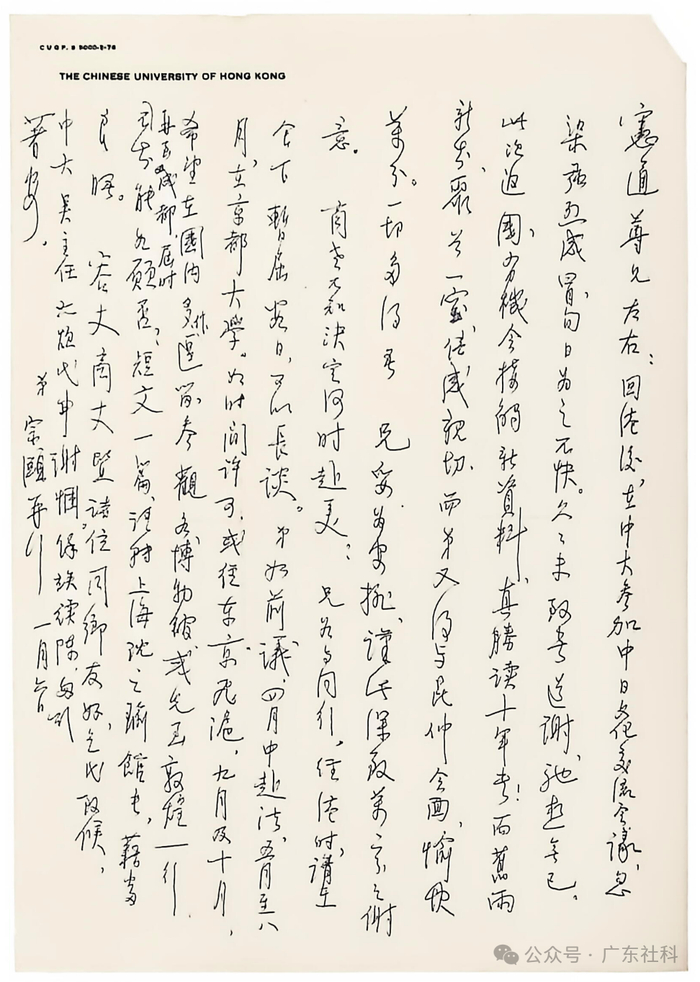 回港后,在中大参加中日文化交流会议,忽染强烈感冒,旬日为之不快。久久未致书 道谢,驰想无已。