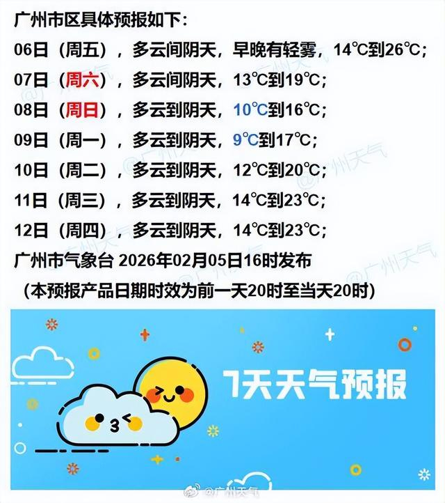 6日,粤北市县多云到阴天,有小雨,其余市县多云到阴天,有分散小雨,大部分市县早晨有轻雾或雾,傍晚到夜间气温自北向南逐渐下降。早晨最低气温:南部沿海市县16~20℃,其余市县12~16℃。
