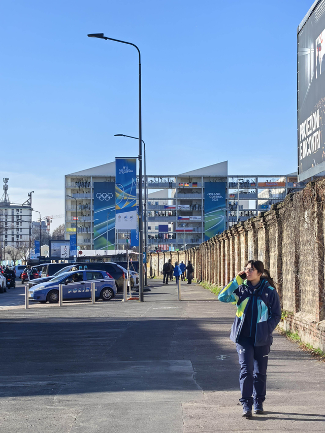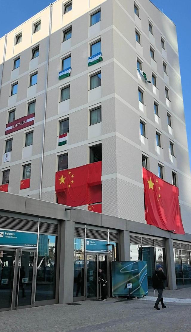 不远处,中国队公寓楼外墙上悬挂的巨幅国旗和憨态可掬的熊猫贴纸也十分醒目。据了解,由于本届赛事分布较散,中国队并未集中入住米兰村,只有短道速滑、速度滑冰和花样滑冰三支队伍驻此,其余队伍则入住相应赛区的奥运村,以节省路途奔波。