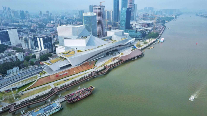 珠江对岸的白鹅潭大湾区艺术中心,集广东美术馆、广东省非物质文化遗产馆和广东文学馆于一体,是名副其实的“岭南文化的标志地、大众休闲的目的地、湾区交流的会客厅”。