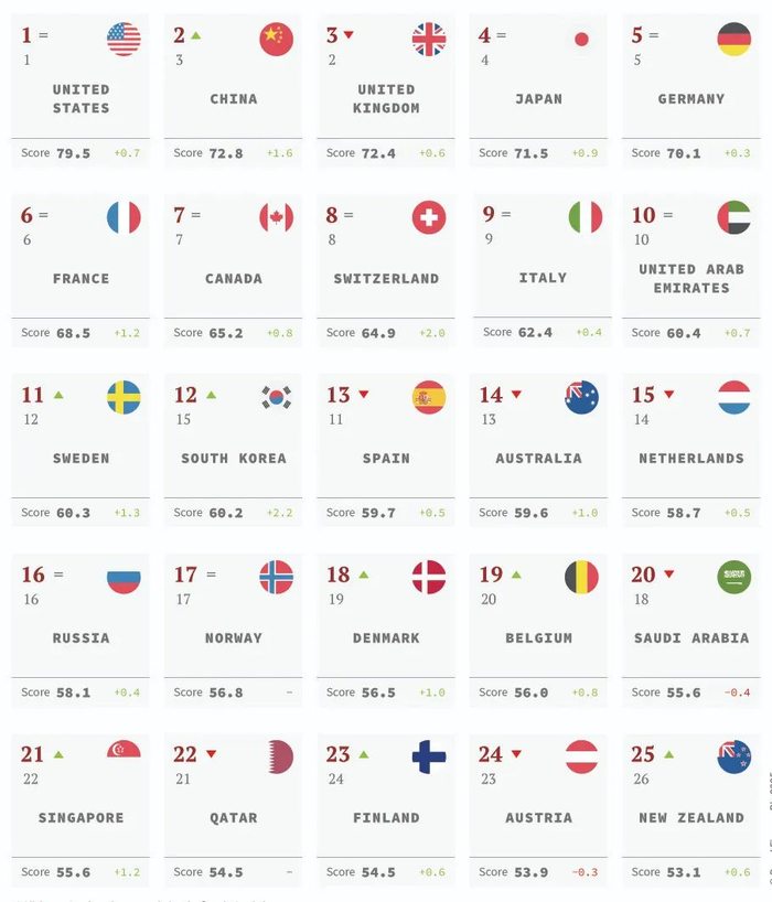 《Brand Finance 2025年全球软实力指数报告》正式发布。该报告历时一年,基于对全球193个联合国全体成员国的17万名受访者调研,系统评估了所有国家在55项软实力指标上的客观表现。报告显示,美国以79.5分(满分100分)继续位居全球软实力榜首,而中国则以72.8分的成绩首度超越去年第二的英国,升至全球第二,创造了中国在该全球指数报告中的历史最高记录。