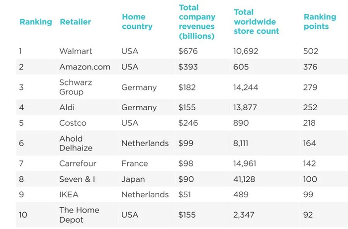 榜单根据零售商的国内和国际零售收入计算分数进行排名,上榜的公司要在至少三个国家和地区进行直接投资。