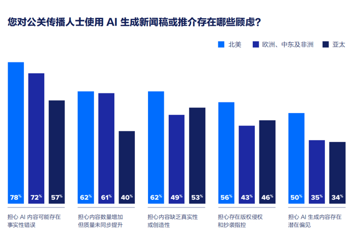 另外,媒体记者对于公关传播人员使用生成式AI这一问题时持开放态度,仅27%的受访者表示“强烈反对”。其中,北美记者对公关传播人士使用 AI 的反对声最为强烈,高达五分之二的受访者表示强烈反对;与之形成鲜明对比的是亚太地区记者,该群体对 AI 的使用度和接受度相对更高。
