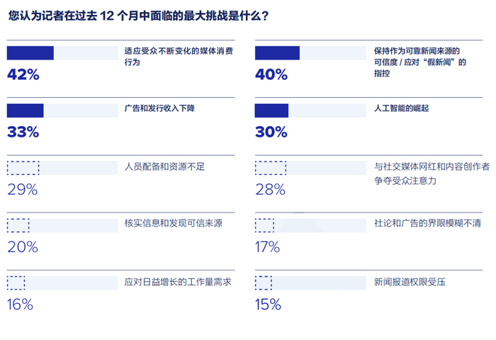 报告显示,连续多年作为全球媒体记者最大挑战的——“保持作为可靠新闻来源的可信度”/ 应对‘假新闻’,如今已位居第二。而“适应受众不断变化的媒体消费行为”已成为全球记者面临的首要挑战。