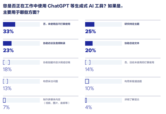记者使用AI的主要用途包括:研究特定主题25%;协助访谈及音频转录23%;协助总结文本20%。其他用途还包括:协助创建内容大纲或初稿;构思采访问题;构思报道选题;制作多媒体;了解受众等。