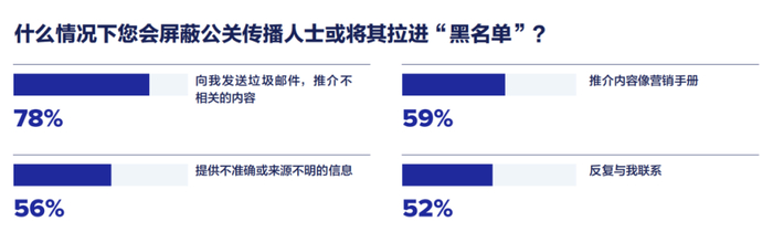如果说有什么比了解记者需求更重要的事,那必定是知道他们的禁忌。当被问及最无法容忍的公关行为时,“向我发送垃圾邮件,推介不相关的内容”高居榜首(不过亚太地区记者对此容忍度较高),其次是“包装成软文的推介”。在所有地区,“提供不准确或来源不明的信息”均位列前三雷区。