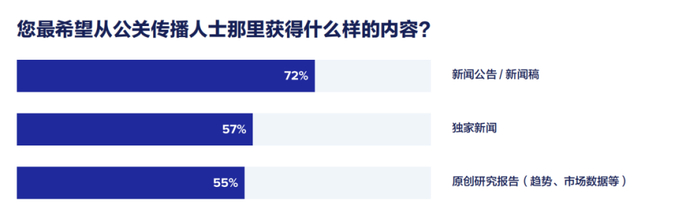 报告进一步探究了公关传播团队联系记者时,提供给他们真正所需的内容有哪些。与历年报告一致的发现是:新闻稿仍是记者最需要的内容。此外,多数记者也表示需要独家新闻和原创研究报告。