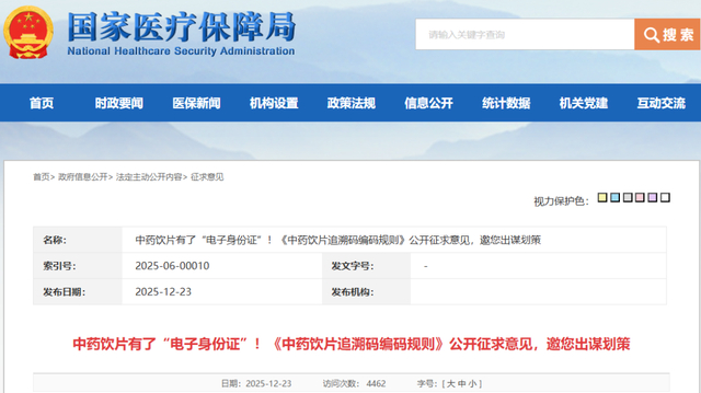 起因是12月23日,国家医保局发布:中药饮片有了“电子身份证”!《中药饮片追溯码编码规则》公开征求意见,邀您出谋划策!