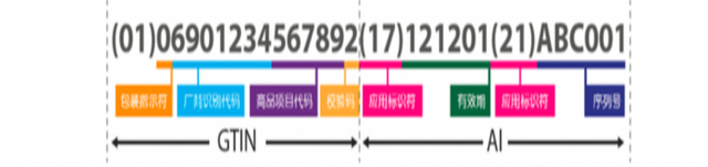 GS1 码第一单元为药品标识码( GS1 全球贸易项目代码, GTIN ),包含厂商识别代码、商品项目代码、校验码等,其中厂商识别代码由中国物品编码中心负责分配和管理,商品项目代码由厂商识别代码所有人(即商品条码系统成员)依据有关国家标准自行分配,校验码由标准算法得出;第二单元为生产标识码( GS1 应用标识符, AI ),为药品编制单品序列号,包含批号、有效期、生产日期等。