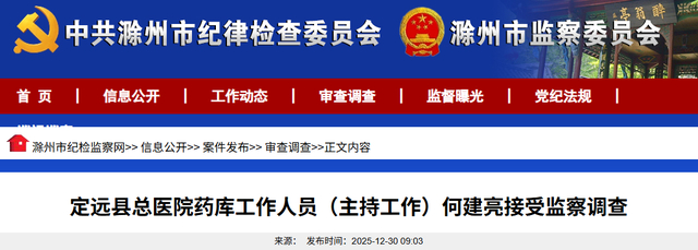 定远县总医院药库工作人员(主持工作)何建亮涉嫌严重违法,目前正接受定远县监委监察调查。(滁州市监察委员会)