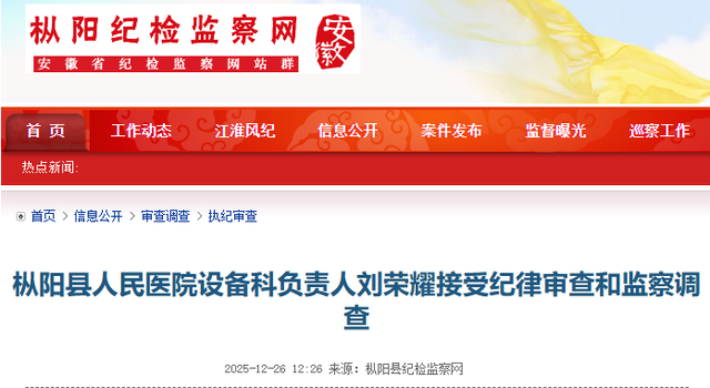 2025年12月,刘荣耀因涉嫌严重违纪违法,接受枞阳县纪委监委纪律审查和监察调查。