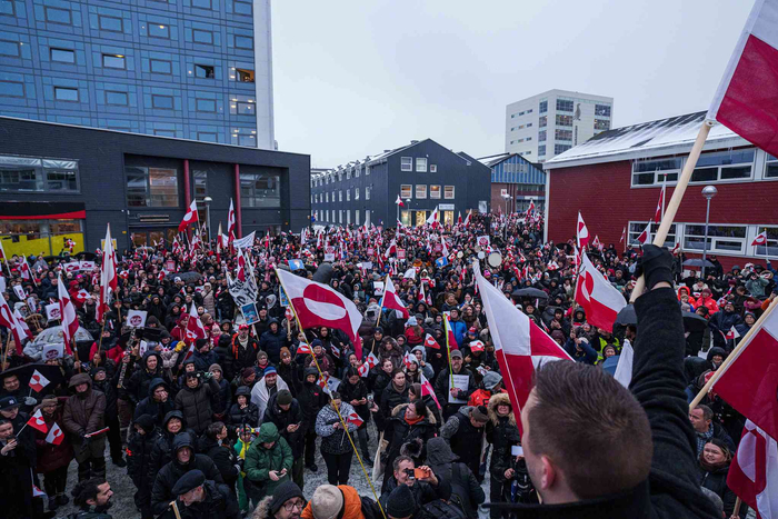 周六,数千名示威者在格陵兰首都努克的冰雪上游行,高呼“格陵兰不卖”,抗议美国总统特朗普接管丹麦自治领土的计划。