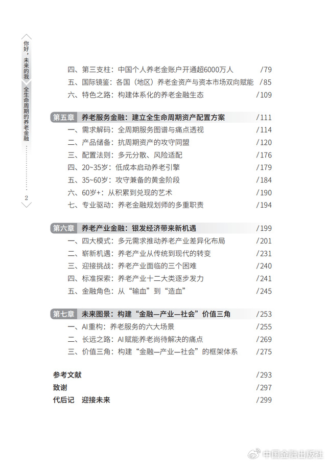 《你好,未来的我——全生命周期养老金融》是一本内容丰富的养老金融工具书,让我们看到了在养老金融领域,银行、保险、证券、基金、信托等各金融机构的提前布局:不仅有琳琅满目的金融产品,还有按照年轻、中年和老年不同人生阶段的资产配置建议,更有线上养老金测算、资产配置模型等成熟的金融工具,能够让我们提前储备未来。
