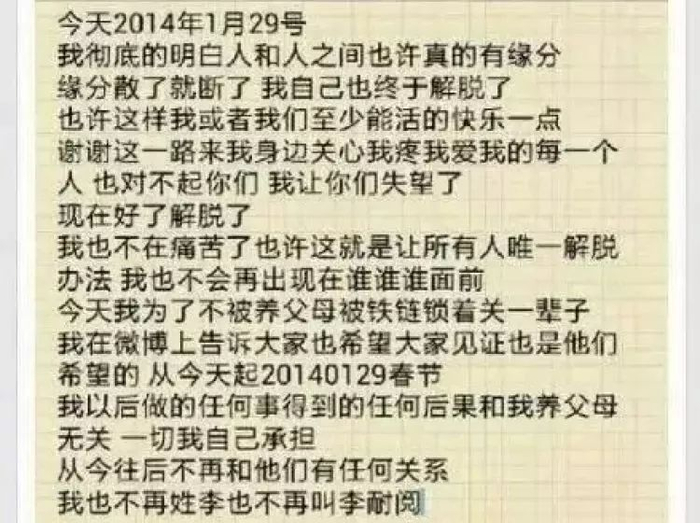 自残之后,李耐阅还公开发微博宣布要跟自己的养父母断绝关系。