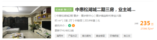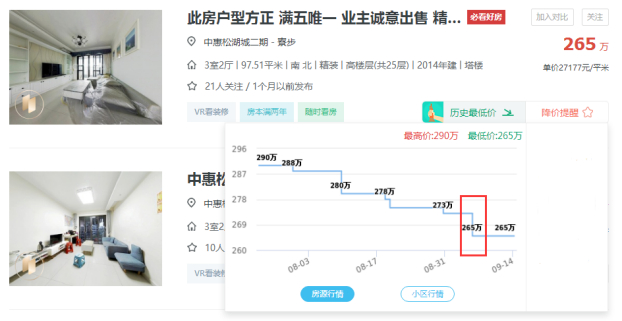 又比如位于东莞寮步新中心中惠松湖城二期下面的这套房源,从总价248万下降到235万。(数据截图日期:9月14日)