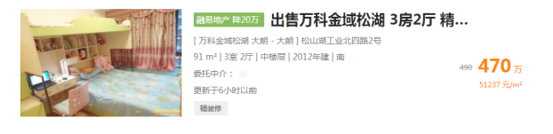 比如位于东莞大朗的万科金域松湖下面这套房源,从总价490万下调到了470万。(数据截图日期:9月14日)