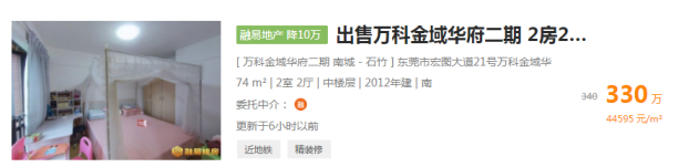 比如位于东莞南城石竹的万科金域华府二期下面这套房源,在诸葛找房上从总价340万降到了330万。(数据截图日期:9月14日)