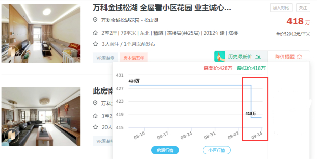 位于松山湖的万科金域松湖花园下面这套房源,9月7日后总价从428万降到了418万。