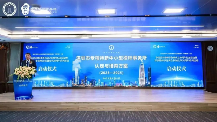 ▲8月4日,深圳市律师协会会长张斌在中国首家律所成立40周年纪念活动暨深圳律所合伙制改革30周年系列活动启动仪式上发布《深圳市专精特新中小型律师事务所认定与培育方案(2023—2025)》