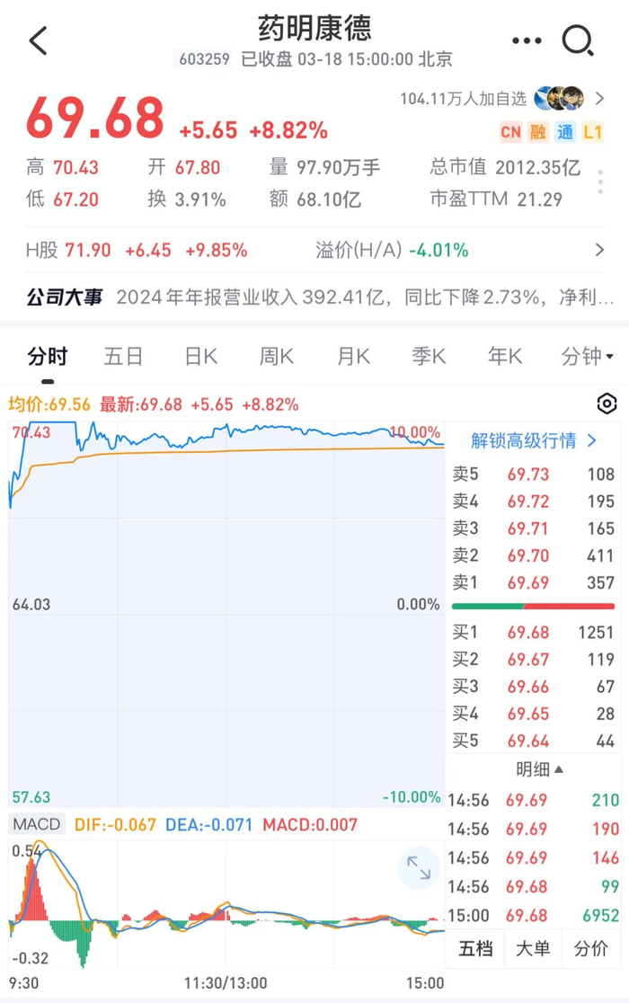 创新药龙头药明康德开盘迅速触及涨停,而后震荡收涨8.8%。