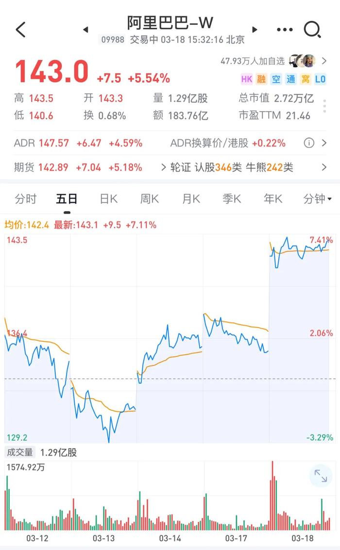 昨晚阿里美股收涨4.5%创新高,今日阿里港股股价高开超5%