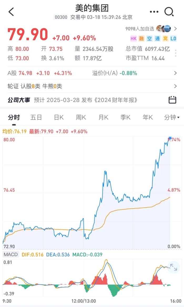 美的集团AH股午后飙升,截止发稿涨近10%,A股收涨4.3%。同时机器人板块也持续活跃,多股涨停。