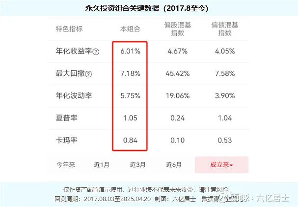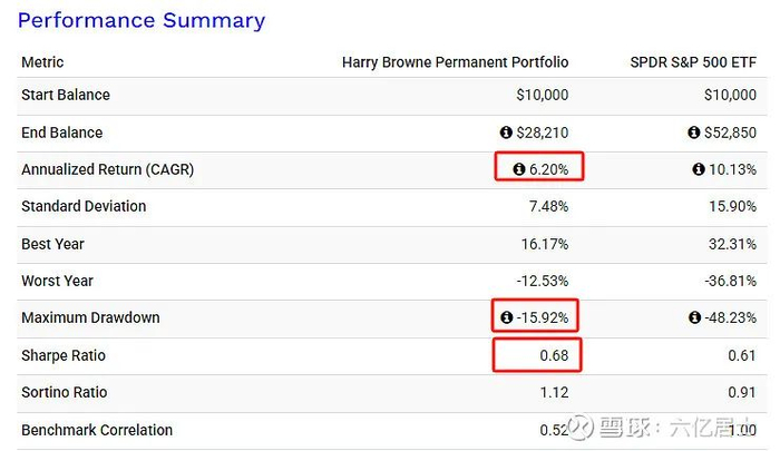 什么目标铸就什么样的结果,永久投资组合因为均配大类资产,权益类占比较低(25%),进攻性稍弱,因此中长期收益率并不会很高(约6-7%)。